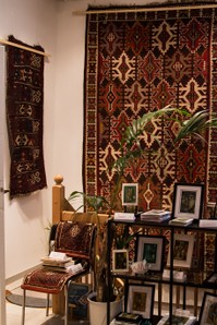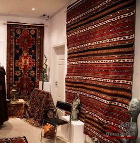 Davor unten der zweite schon erwähnte Stern-Kasak Kelim.Daneben am Fenster ein semi-antiker Teppich vermutlich aus Buchara in Usbekistan.Vor dem Fenster sehen Sie noch einen weiteren gut erhaltenen semi-antiken Mafrash.In unserem Seitenraum direkt hinter dem Durchgang können sie einen schönen sehr feinen vom Turkmenischen Stamm der Tekke gewebten antiken Teppich sehen.Daneben finden sie im Nebenraum noch eine Satteltasche eine Khorjin aus Azerbaidschan und ebenfalls aus dem Azerbaidschanischen Baku einen Teppich.Der hier im Raum auf dem Boden ausgelegte Kelim stammt aus Täbriz im iranischen Azerbaidschan.