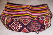 Dieses Exponat hat für mich eine besondere Bedeutung, da es schon ein Geschenk meiner Urgroßmutter zur Hochzeit meiner Großmutter war. Es wurde benutzt als Abdeckung für einen Korsi, einen in iranisch Azerbaidschan verbreiteten Wärmetisch unter dem die Familie oder die Gäste im Winter ihre Füße an einer Kohleglut wärmten.Der kleine Teppich ist ein antiker Shirwan-Kazak aus dem azerbaidschanischen Bergland.Bei einem Teppich werden einzelne kurze Fäden die später den Floor bilden in die Kettfäden eingeknotet und dann durch den Schussfaden voneinander getrennt. Je nach Region werden viele verschiedene Knotentypen unterschieden. Die Qualität wird dabei auch durch die Anzahl der Knoten und das verwendete Material, also z.B. Wolle oder Seide bestimmt.Hier unten sehen Sie zwei Mafrash in Sumagh-Technik. Es handelt sich dabei um Gewebe, die von Nomaden als Kinderwiegen und Transportbehältnisse oder auch zur Abdeckung von Kästen und Truhen verwendet wurden.