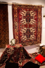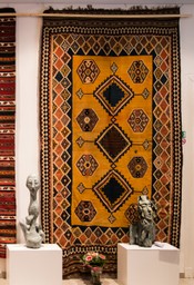 Bei der Sumak-Technik werden die Musterfäden um die Kettfäden geschlungen und anschließend ein Schussfaden eingewebt, wodurch ein Untergrundflor entsteht, der dem Teppich besondere Isolationsfähigkeit gibt. Sumakteppiche wurden deshalb auch gerne als Material zur Erstellung von Wiegen oder zur Isolation gegen den Wüstenboden verwendet.Hier ein weiterer antiker, schon stark abgenutzter Teppich, auch ein Shirwan-Kazak aus Azerbaidschan.Als Kazak werden kaukasische Hochland-Gewebe mit stark geometrischen, gleichmäßigen, oft auch groben Mustern bezeichnet.Bei dem großen über der Treppe hängenden und fein gewebten semi-antiken Kelim und dem ganz ähnlichen hinter Ihnen über einem Gestell ausgebreiteten Kelim handelt es sich um aus dem nördlichen Azerbaidschan stammende Stern-Kasak.Bei einem Kelim wird der Schussfaden so eingewebt, dass er auf beiden Seiten des Gewebes das Muster bildet. Bei einem Schlitzkelim wird der Lauf des Schussfadens zur Musterbildung an bestimmten Stellen umgekehrt, so dass die typischen Schlitze entstehen. Diese Art der Herstellung ist insbesondere im Kaukasusgebiet, dem Iran und Kleinasien, seltener auch Zentralasien beheimatet.Der schmale antike Kelim neben der Tür, der wohl als Pferdedecke diente, stammt aus Zentralasien, möglicherweise Buchara.Auf dem Stuhl neben der Treppe sehen sie eine semi-antike Satteltasche, eine Khorjin aus Azerbaidschan, die in Sumak-Technik gearbeitet ist.Der große in gelben Farbtönen gewebte semi-antike Kelim ist ein von den Gashgai Nomaden der persischen Region Fars gewebtes Stück.
