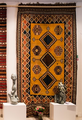 ![]() »Nomadenkunst« Antike Teppiche, Kelims und Gewebe aus dem Orient Ausstellung vom 13.02.2016 – 9.04.2016 Öffnungszeiten jeweils Di. bis Do. 14 – 20 Uhr (Falls sie eines der ausgestellten Stücke erwerben möchten, kontaktieren Sie bitte direkt die ART-Galerie-Benakohell) ![]() | |